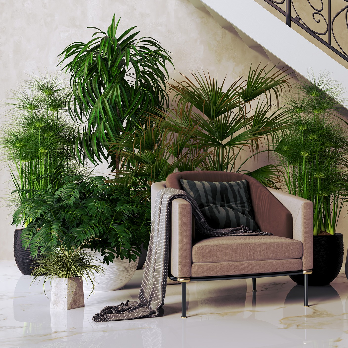 設計說明:多種盆栽搭配黑與白質感花器,居家現代感氛圍強烈,適合居家擺設。