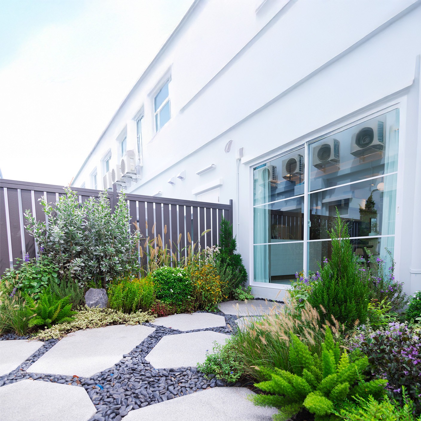 設計說明:結合迷迭香、薰衣草、薄荷等香草植物,鋪設大板石材,適合廊道間,創造亮點。